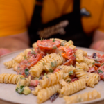 Once the pasta is finished cooking, drain it and spread it out on a sheet pan to cool off quickly.Add the pasta over the prepared vegetablesPour the dressing over the pasta and vegetables, and mix well.Taste and adjust seasoning as needed.